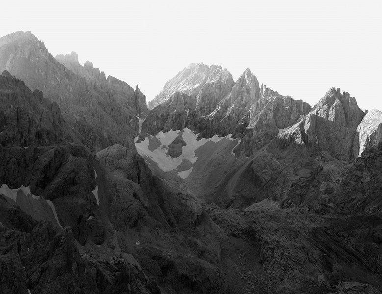 No es casual que emplee los grandes formatos en todas sus series. Recordemos que el formato nunca es inocente y que, entre otras cosas, establece el distanciamiento con el espectador. Así, un formato pequeño genera una lectura única, privada, íntima de la fotografía. Los formatos de Maselli lo son, en cambio, de lectura enorme y monumental, abrumadora, solemne, pública, no privada. Tampoco es casual el predominio del blanco y negro en sus proyectos para abstraer, conceptualizar y simbolizar más la imagen huyendo de todo atisbo de visión científica del paisaje. En el trabajo que les presentamos, Infinito Artificial, en el que, entre otras cosas, recurre a una elaborada postproducción digital, nuestro artista hace una reflexión sobre el concepto de lo sublime a través de las ideas del escritor, filósofo y político Edmund Burke. Maselli busca esa sublimación en elementos paisajísticos como la majestuosidad, la inmensidad, la enormidad y la vastedad de la naturaleza pero en especial en lo que Burke denominó infinito artificial. Según Maselli «éste consiste en la sucesión y uniformidad de las partes, es decir, un elemento que se repita muchas veces en una configuración constante y sin interrupciones genera en el espectador una sensación de in nito. Para conseguir este efecto, paso varios días haciendo vivac en alta montaña y retratando el mismo macizo montañoso desde varios ángulos para luego, en mi estudio, recomponer esas piezas en un paisaje nuevo, imaginado, buscando, con la repetición de estas imágenes, conseguir el efecto de infinito artificial y abordar el concepto de lo sublime de nido por Burke.» Son montajes en gran formato, en los que se intenta proyectar la experiencia de lo sublime a partir de una naturaleza inventada, artificial e infinita que es fotografiada y representada de una manera contemplativa, buscando una gran excelencia estética al mirarla. (Texto de Jesús Micó, comisario de la muestra).