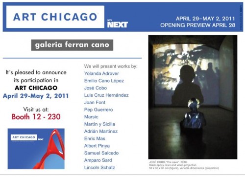 La Galería Ferran Cano de Barcelona participa en la feria de arte contemporáneo Art Chicago 2011. La feria tendrá lugar del 29 de abril al 2 de mayo y la galería barcelonesa ocupará el Stand 12-230. A continuación puedes ver los artistas con los que Ferran Cano asiste al evento americano.