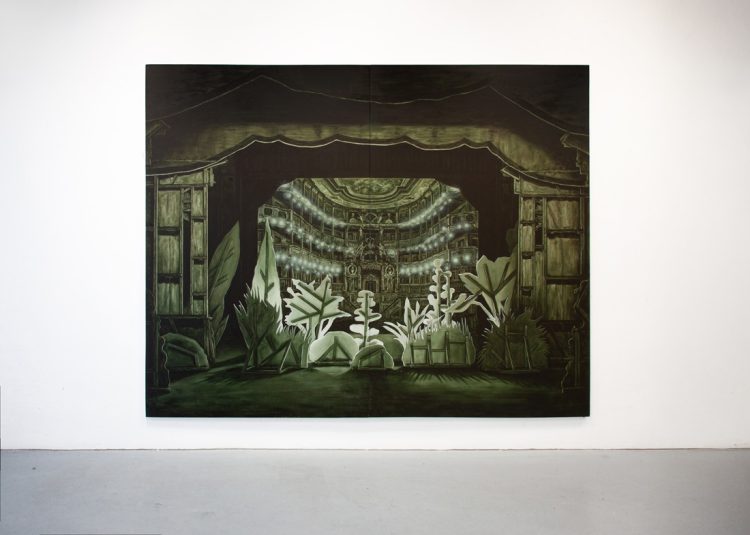 «Tiene un poco del Teatro Martí de La Habana y también mucho de invención» -me comenta el día de la apertura frente a “El gran jardín”. Creo entonces que este es un elemento clave para acceder a la muestra. Si por un momento nos detenemos a pensar en la narración, podemos asumir que el acto de ficcionar es indisociable a ella; aunque pretendamos recordar y reconstruir los hechos tal cual han sucedido, estamos a la deriva de la memoria. Pensamos, por tanto, en la narración como la representación de los hechos y no los hechos en sí mismos, el arte representa la realidad, la interpreta y en ese ejercicio crea una propia. No percibo, entonces, una bitácora de su cotidianidad fáctica más inmediata. Por el contrario, el velo cromático que cubre a todas las piezas y las agrupa con coherencia, nos habla quizás de una ensoñación, de una mirada personal que filtra sus estímulos, el relato de acontecimientos específicos dentro de una historia.