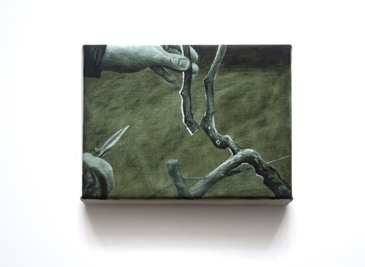 Siete piezas -dispuestas una a continuación de la otra- componen “El injerto”, como si se tratara de fotogramas, enfatizando así su voluntad narrativa. En un plano detalle describe cómo unas manos cortan una rama que posteriormente será plantada. Por tanto, no se trata solo de la acción que acontece durante estos siete momentos, sino todo lo que ocurrirá después, nos provoca avizorar el nuevo emplazamiento para esa nueva planta que ganará independencia. ¿Ese nuevo árbol será “El ficus” emplazado a pocos metros? Especulaciones, en definitiva, el fin último de la ambigüedad. Per sí es cierto que una vez más nos sorprende la factura de la pieza, la pintura logra con la figuración sobre la madera recortada según la silueta del ficus, la descripción de la realidad.