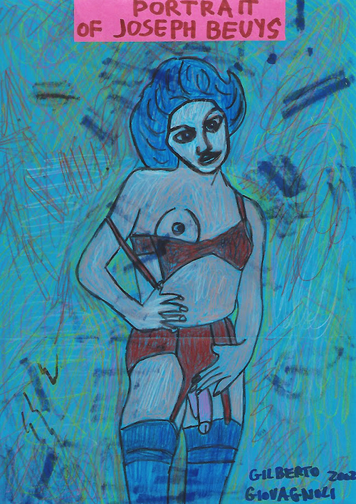 Gilberto Giovagnoli (San Marino, 1954) excede por completo la línea y en ese exceso, el bolígrafo y el rotulador adquieren dimensiones épicas. Aquí el estilo pictórico predomina y estalla en color para arrancar el dolor, la rabia y la sexualidad de la realidad de los poetas o de los marginados, alternativa única a la congénita capacidad destructiva del poder de cualquier signo (Hitler/Stalin). La inserción de texto en las composiciones introduce una alternativa temporal al estatismo propio de la imagen incidiendo poderosamente en el acto de contemplación.