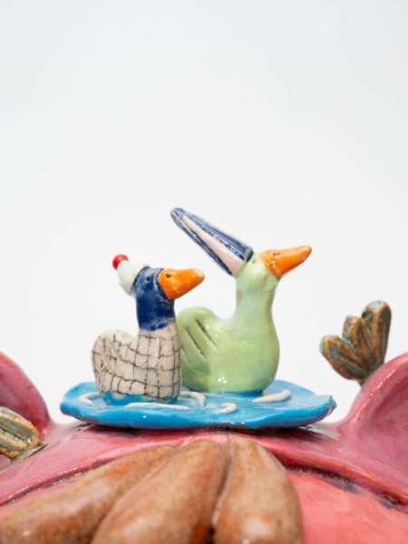 En el espacio expositivo, las esculturas dialogan entre sí como ingredientes de una misma receta emocional. Cada pieza participa de un mismo fuego lento donde lo íntimo se mezcla con lo absurdo, donde la risa y la melancolía coexisten sin jerarquía. A través del color, la artista construye micromundos de ternura y extrañeza, lugares donde lo fantástico se infiltra en lo cotidiano, desprendiendo vapor, memoria y deseo.
